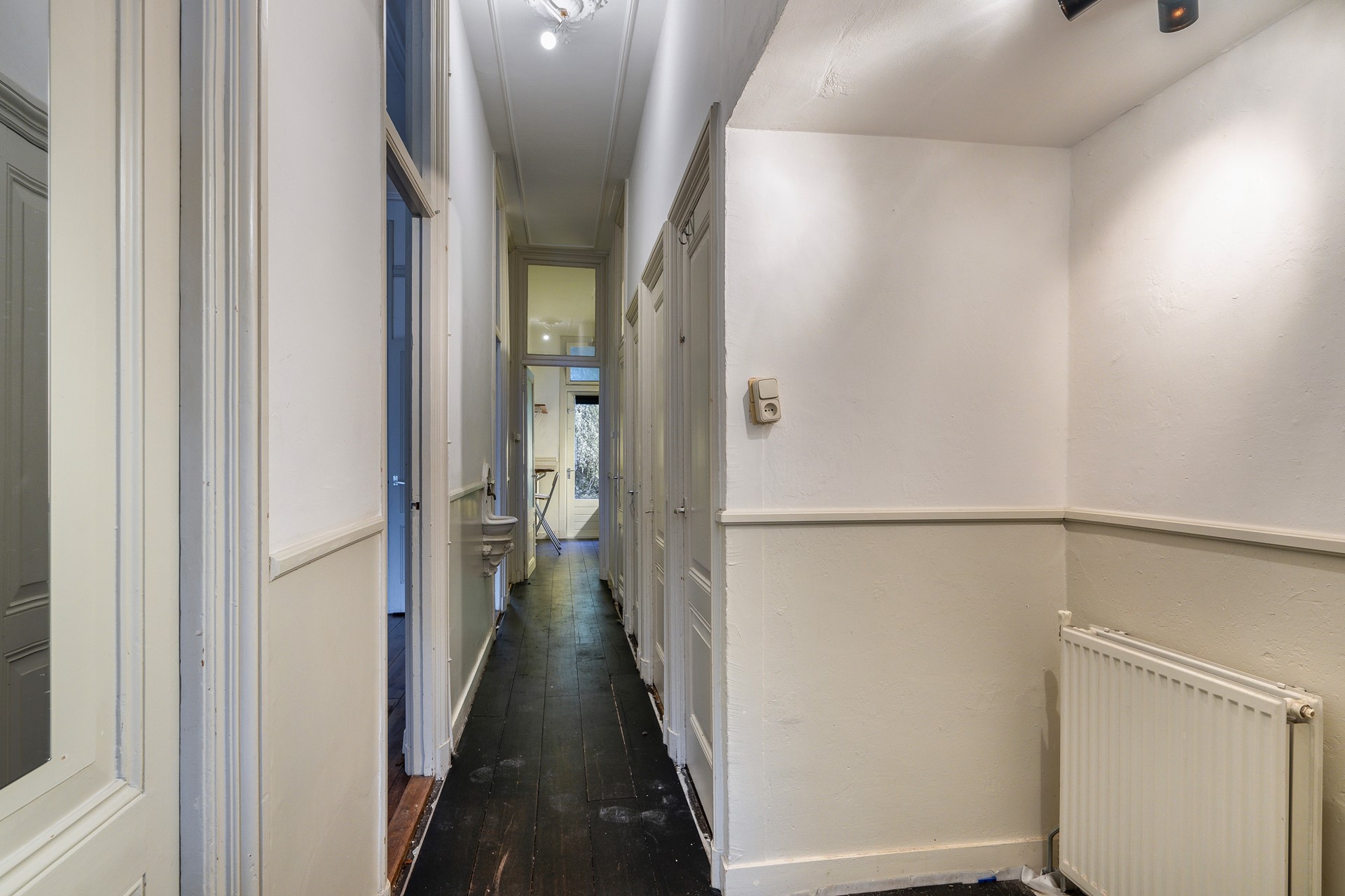 Vanaf de entree met prachtige klassieke deur, tochtportaal met originele tegels en lange gang met historisch fonteintje bereik je alle ruimtes.