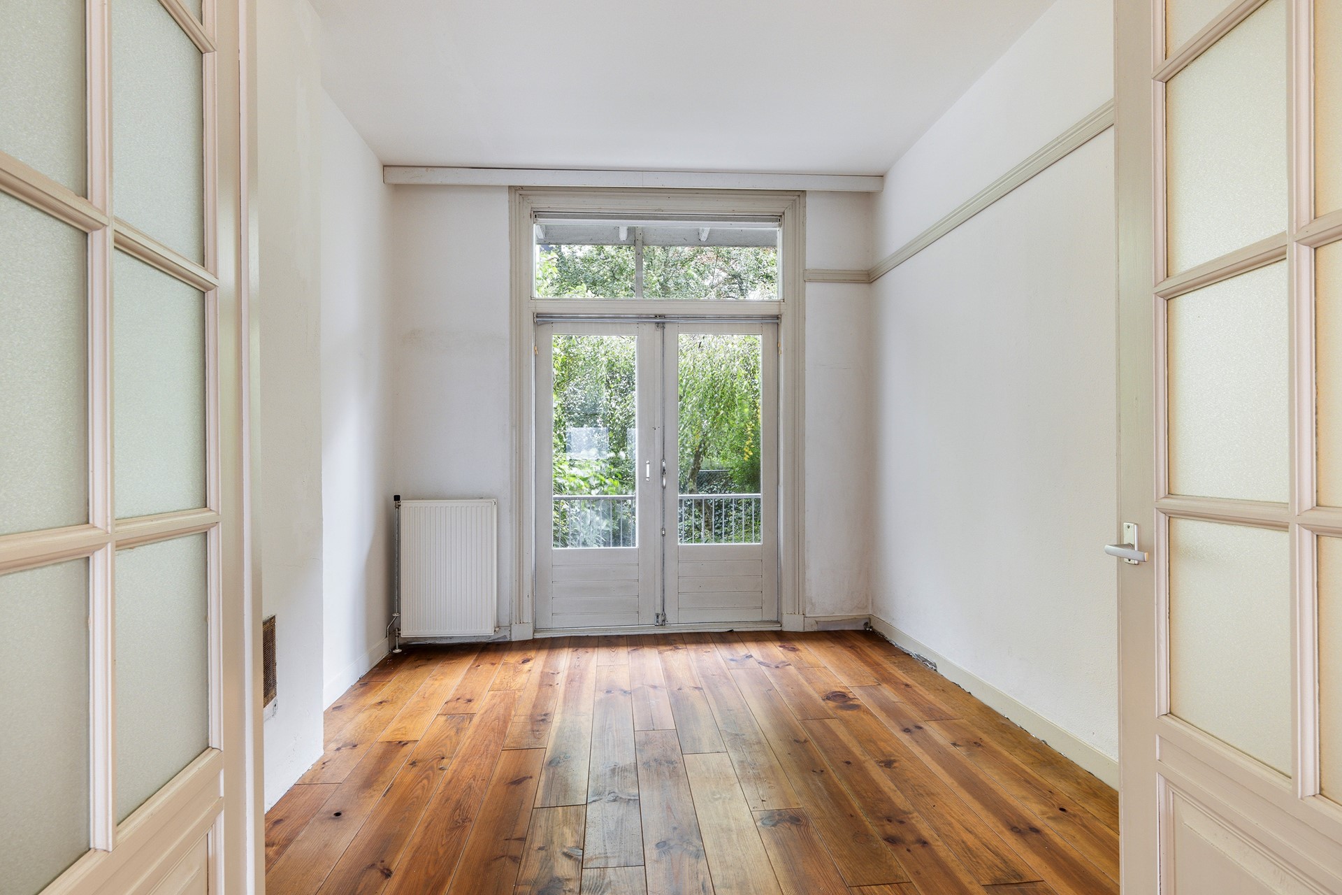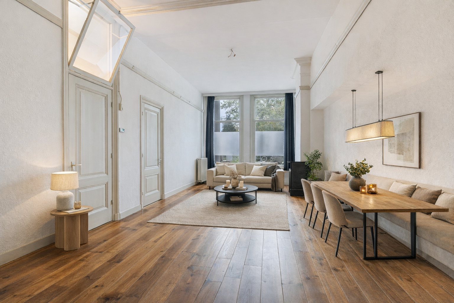 De ruime woonkamer (voorheen kamer-en-suite) biedt volop ruimte en licht, ideaal om zowel een gezellig zitgedeelte als een eethoek te creëren. Door de hoge ramen ervaar je een zee van licht en ruimte en heb je een fijn contact met de straat.